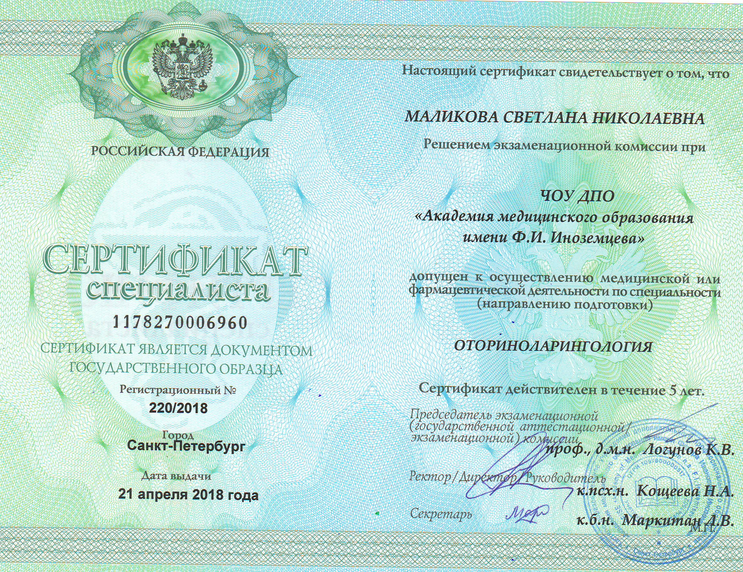 Сертификаты специалиста по специальностям "Отоларингология" и "Сурдология-отоларингология".