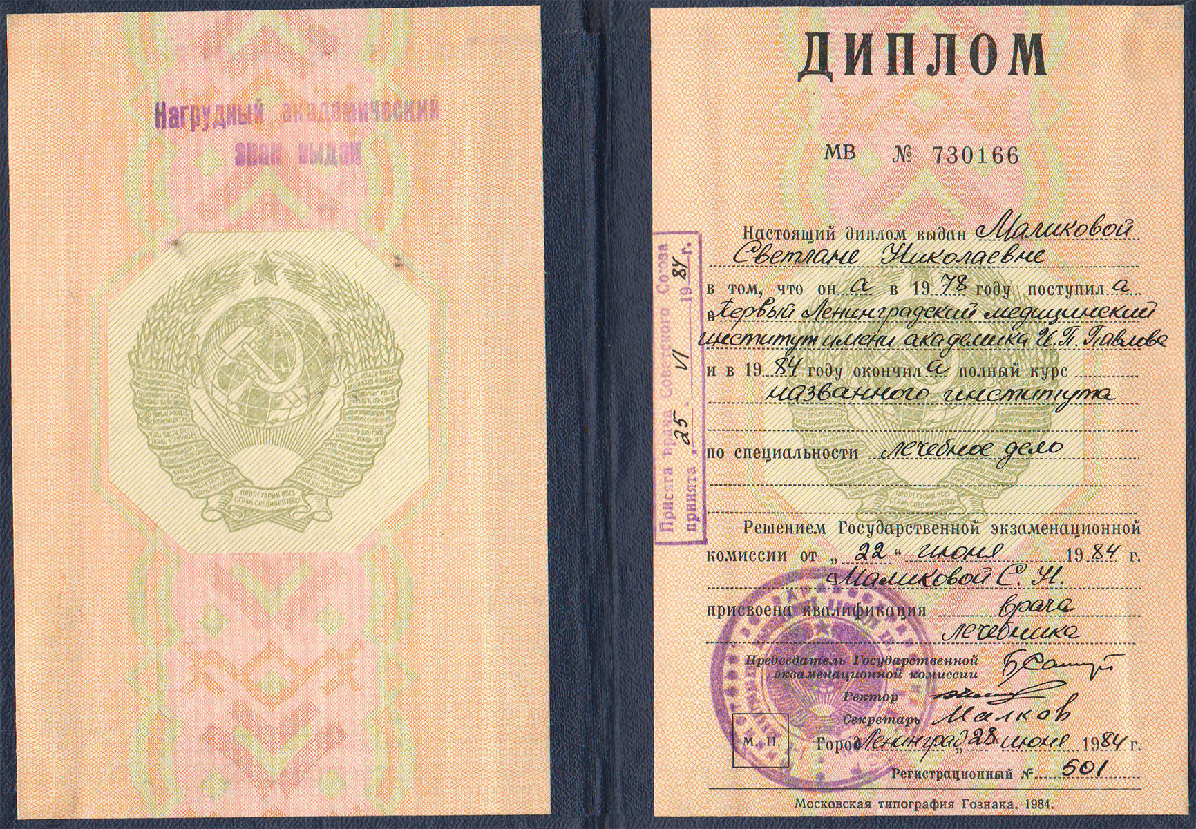 Закончила I Ленинградский медицинский институт им. академика И.П. Павлова в 1984 году по специальности "Лечебное дело".