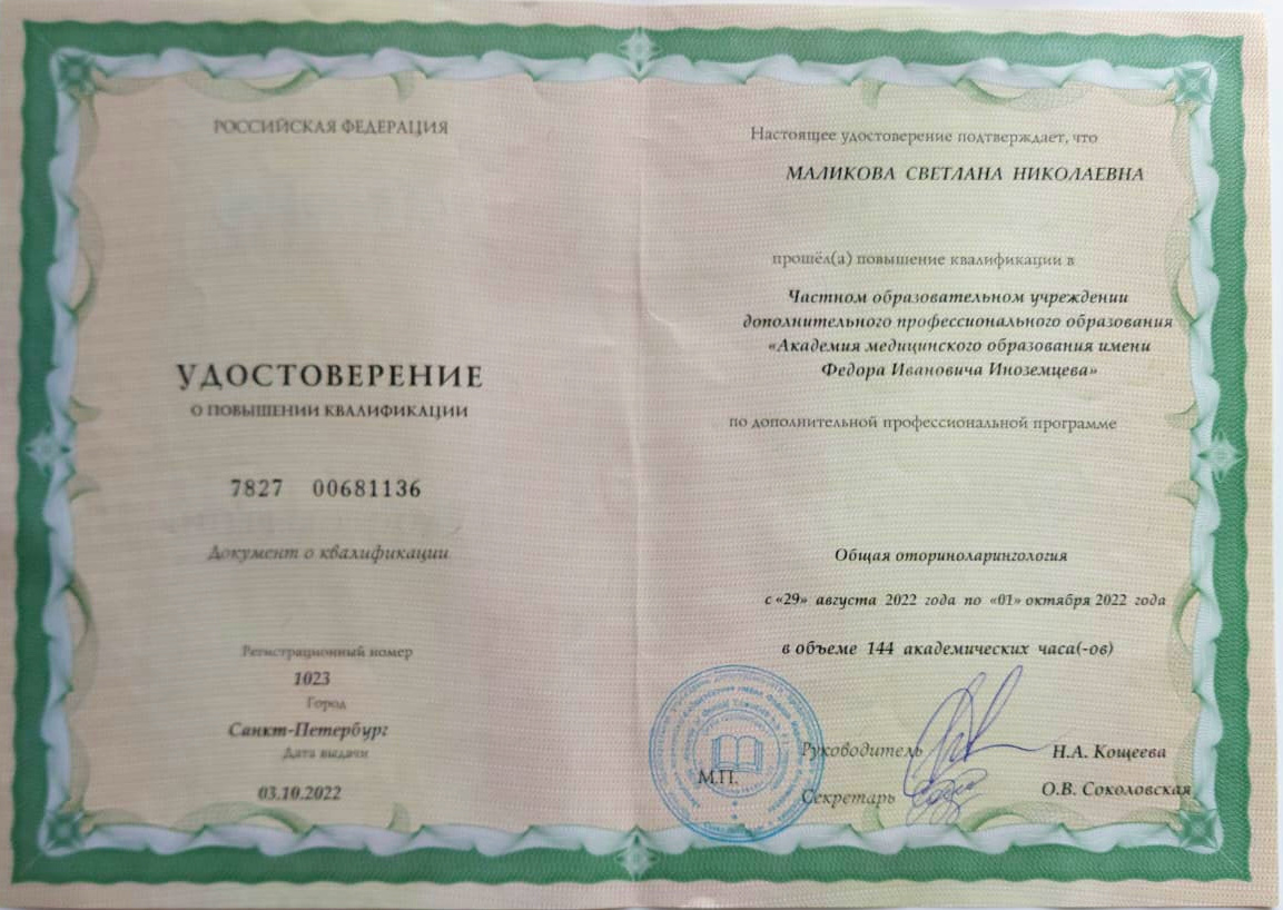 По итогам прохождения аккредитации специалиста аккредитуемый(ая) Маликова Светлана Николаевна (СНИЛС 010-617-149 97) признан(а) прошедшим аккредитацию специалиста.