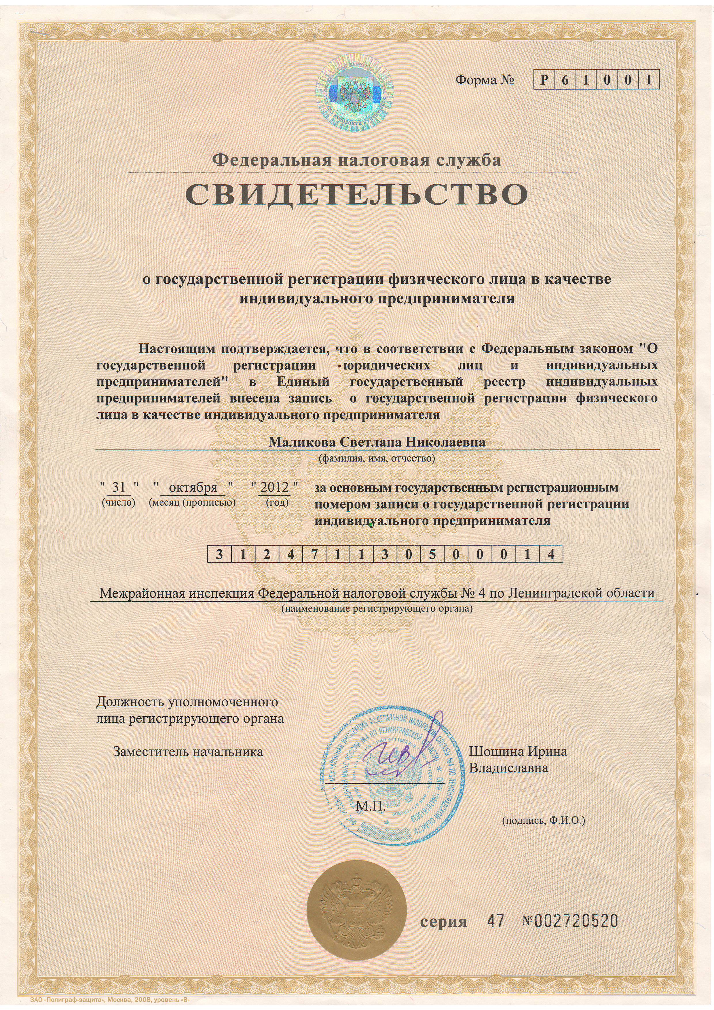 Свидетельство о государственной регистрации физического лица в качестве индивидуального предпринимателя. Серия 47 №002720520 от 31 октября 2012 г. за основным государственным регистрационным номером записи о государственной регистрации индивидуального предпринимателя 312471130500014 (ОГРН). Межрайонная инспекция Федеральной налоговой службы №4 по Ленинградской области.